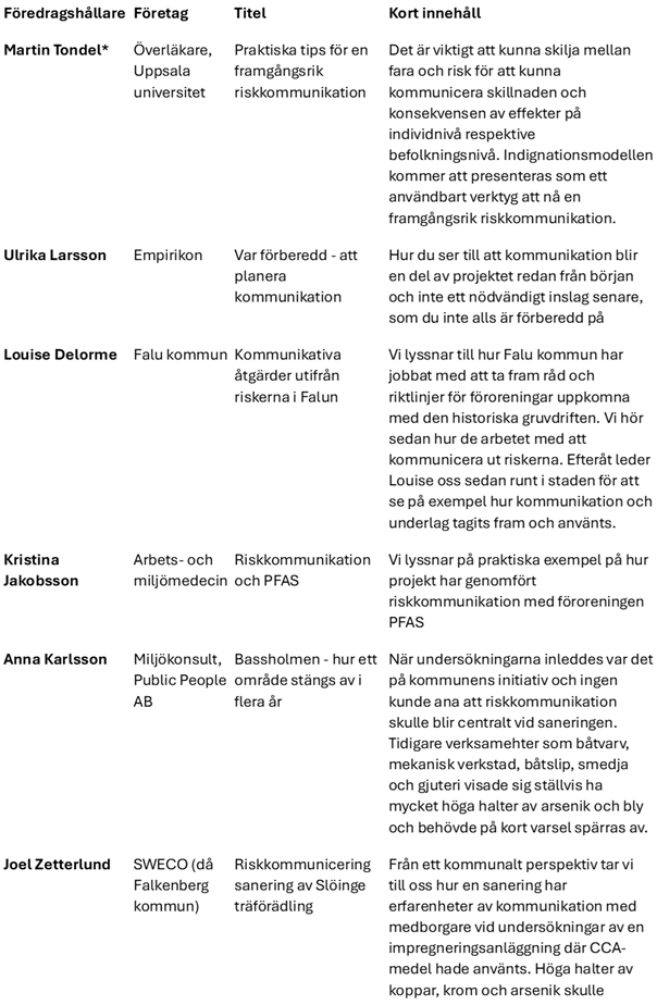 Temat är Riskkommunikation. Dagen kommer fokusera på kommunikation, både utifrån planering av riskkommunikation, hur det kan genomföras från små och stora projekt men även ur ett mottagarperspektiv och hur en tar emot information om risk.